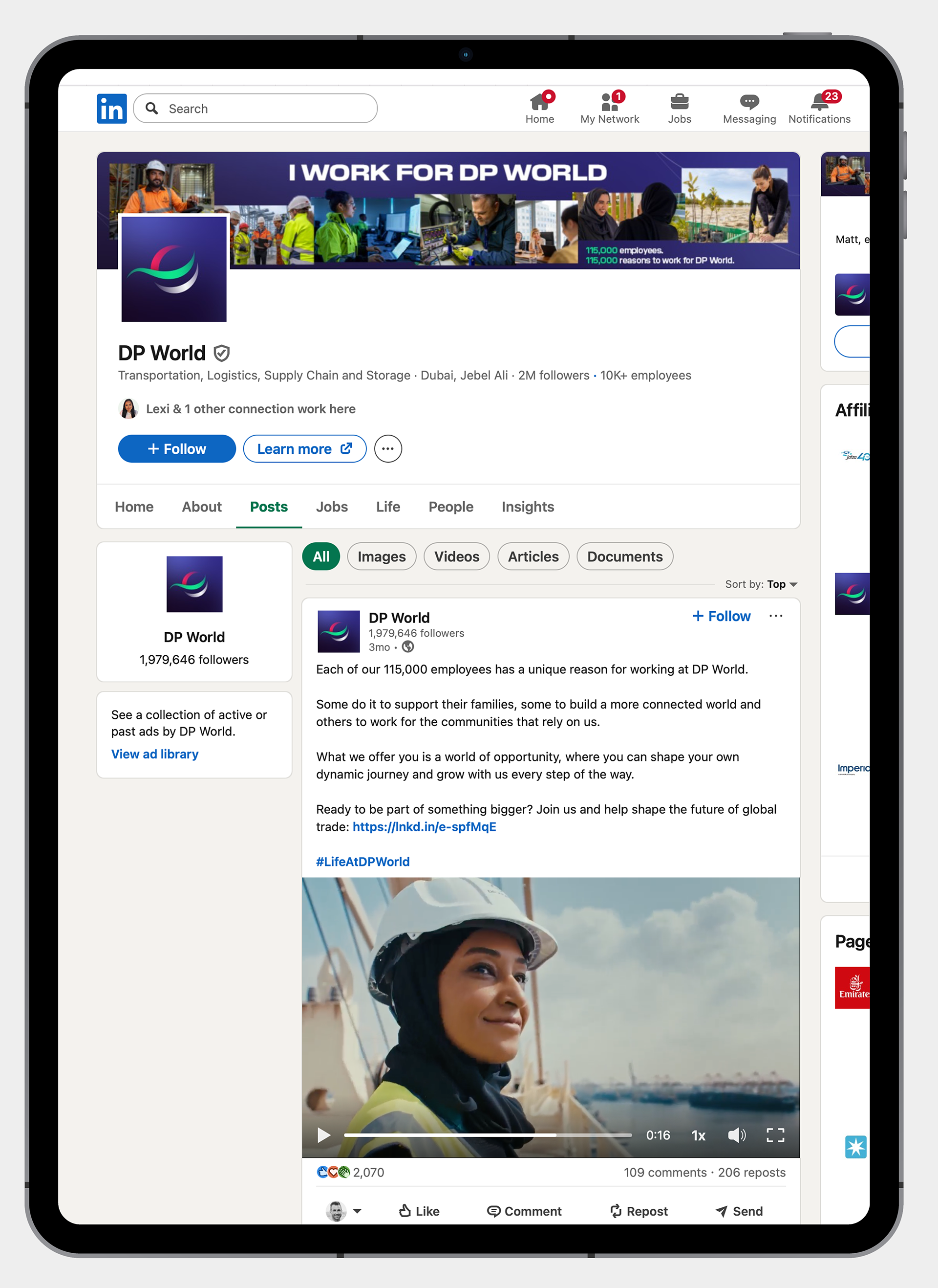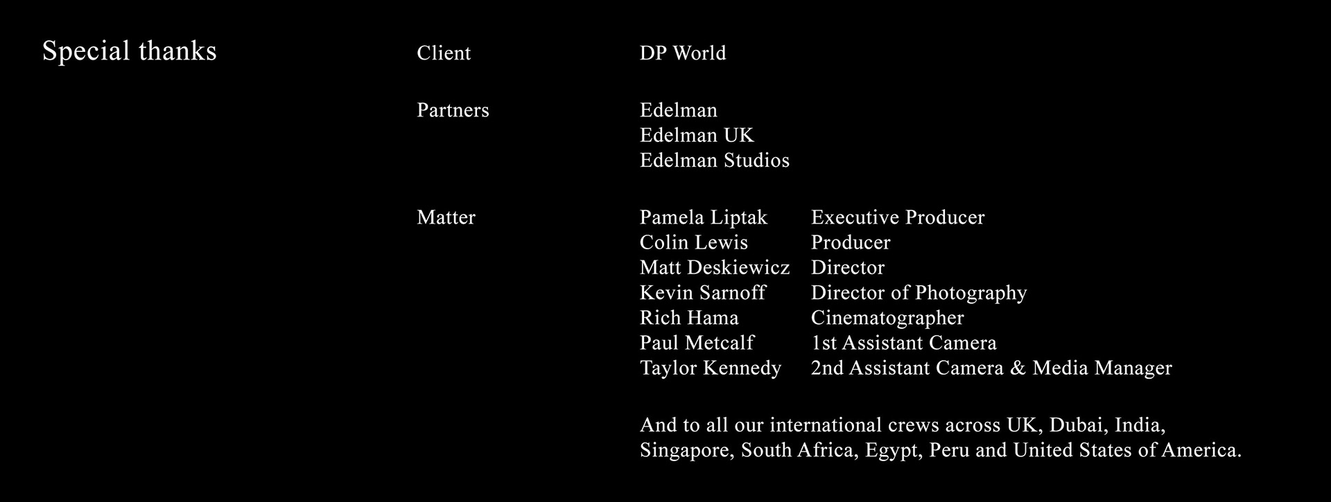 As the director of the DP World commercial and global campaign for Edelman, I brought the creative vision to life, delivered authentic, meaningful stories and showcased the greatest strength of its worldwide logistics enterprise: human power.